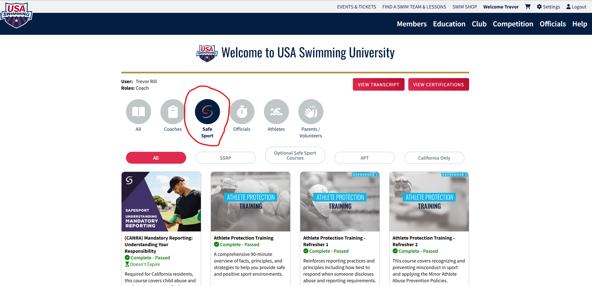 Step 4. Once you access the Course Catalog, click on the big "Safe Sport" icon to filter out only the Safe Sport courses. Looks Like This
