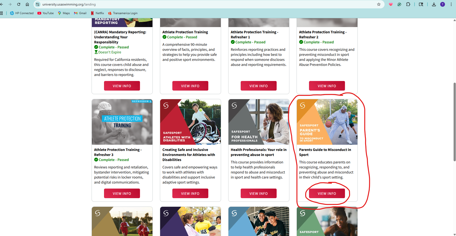 Step 5. Navigate through the page and find the course called "Safe Sport Parent's Guide to Misconduct in Sport" and click "View Info". Looks Like This